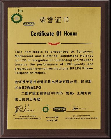 • 珠海BP、凯泰克化工所颁发的荣誉证书
