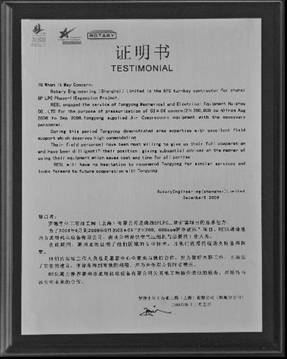 • 罗德里化工石油工程(上海)有限公司颁发的荣誉证书